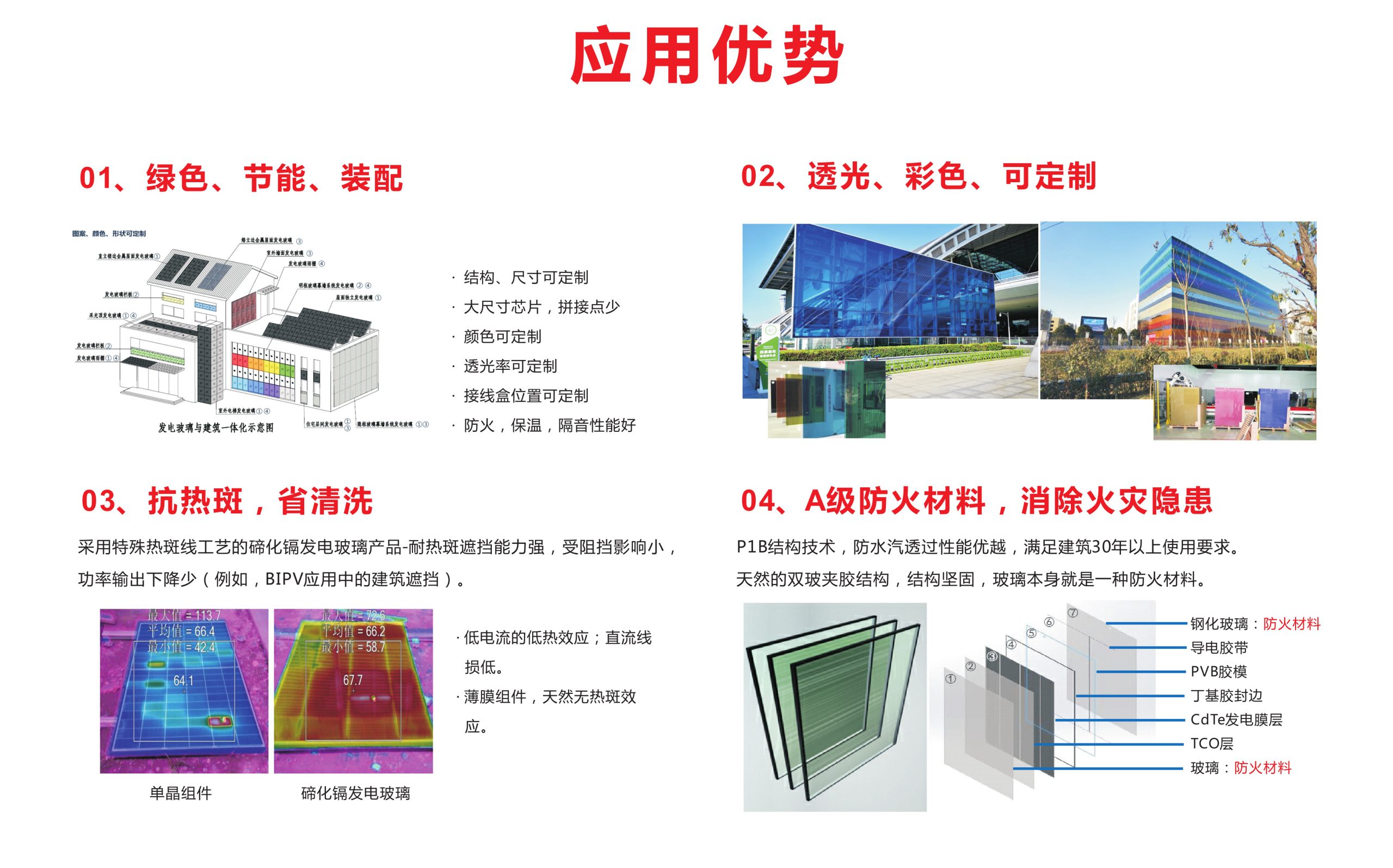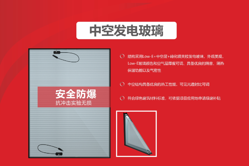 碲化镉发电玻璃——中空系列 中空系列适用场景适用于建筑幕墙、平开窗、采光顶等。隔音、隔热、保温性能好;均质透光,替代建筑LOW-E玻璃;尺寸可定制,可实现超大尺寸拼接;防火、高强度,安全可靠。 点击下载 产品规格书
